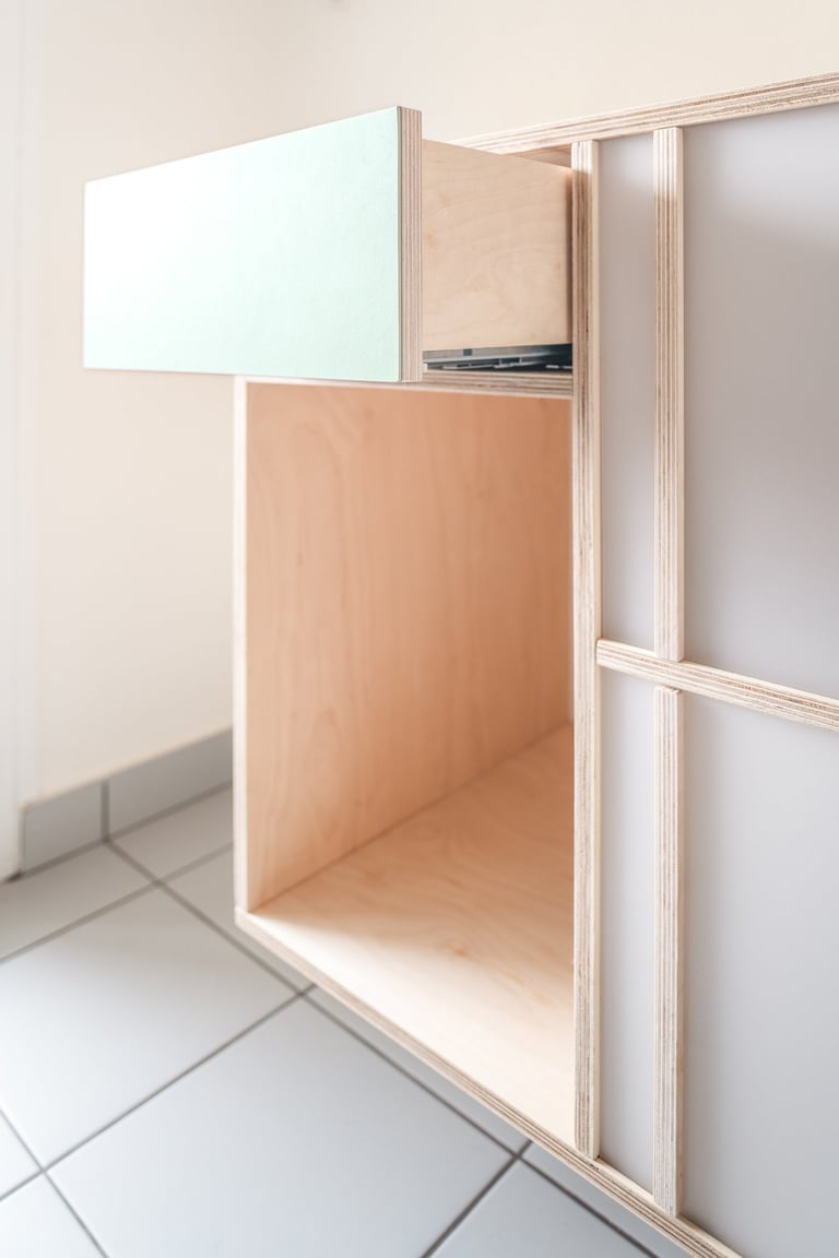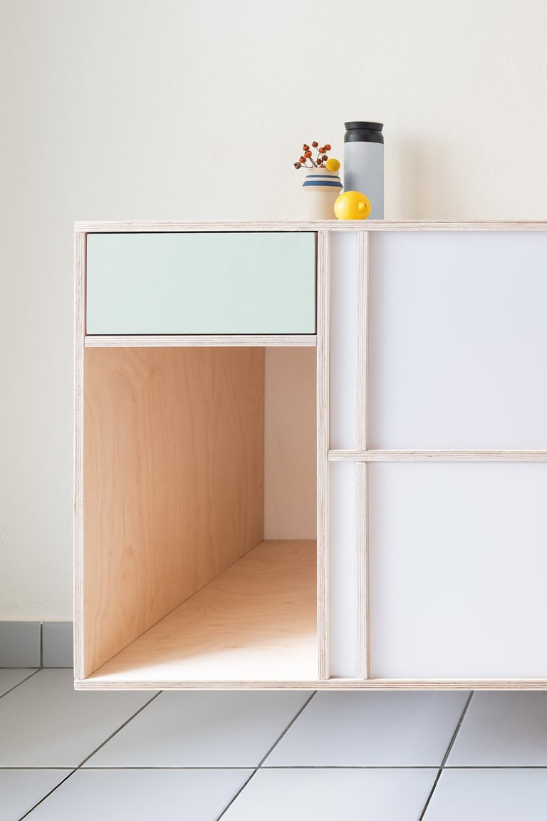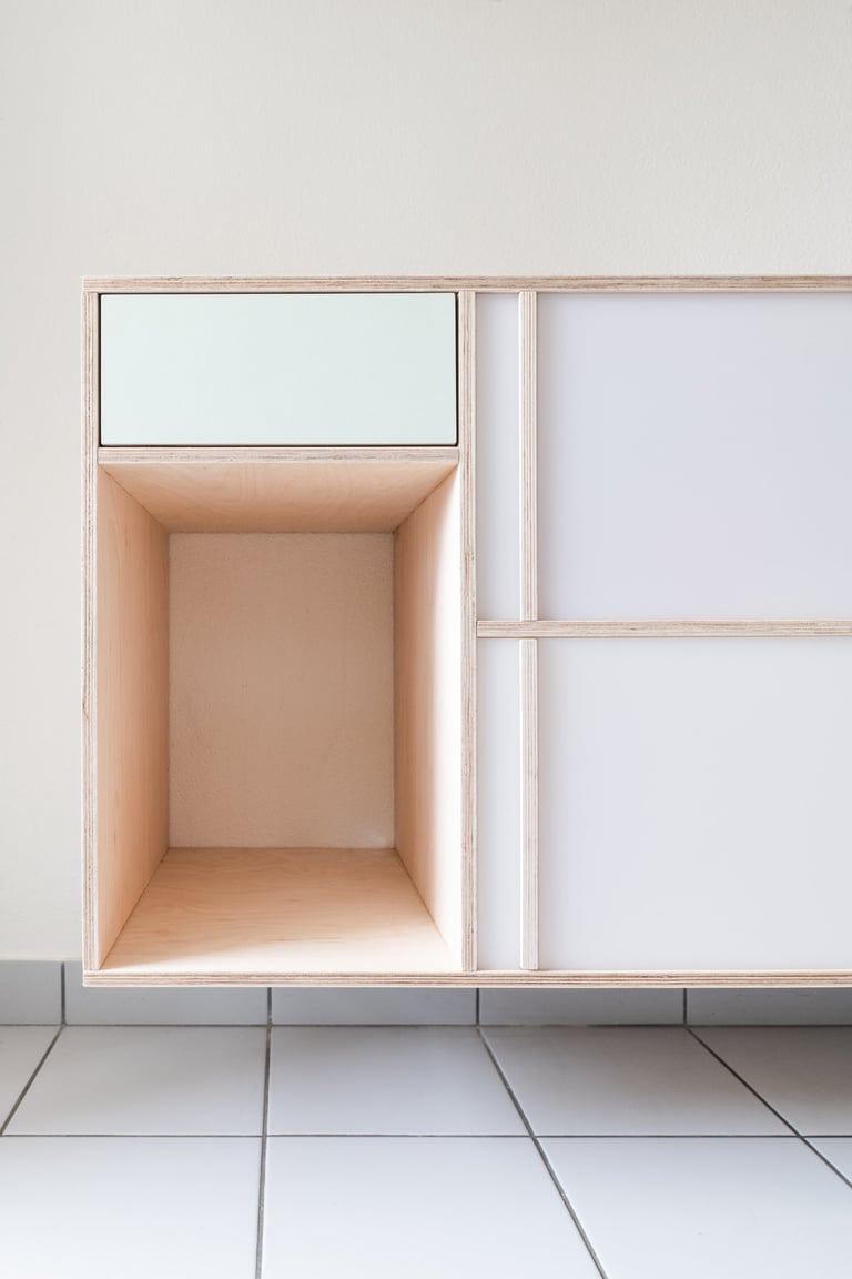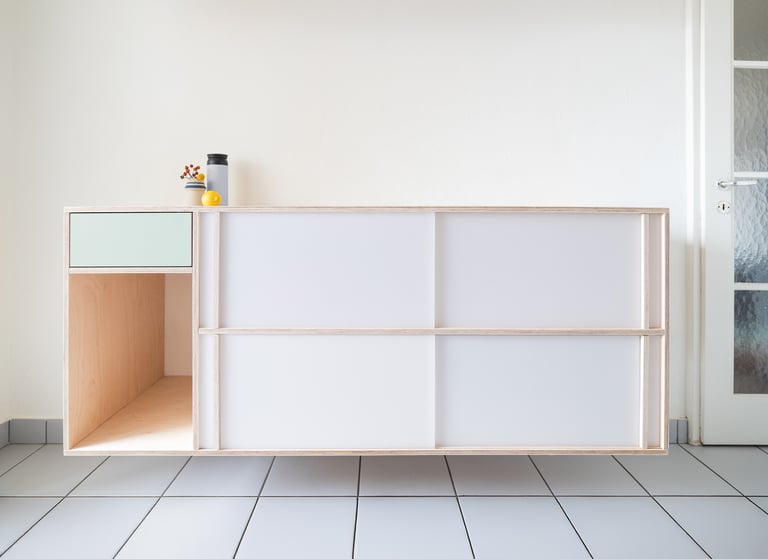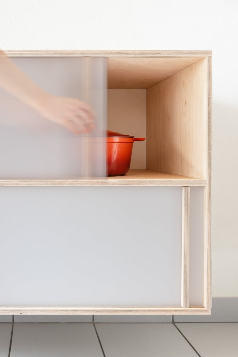 The starting point was clear: the kitchen area of a private client needed an upgrade through a piece of furniture that not only enhances the visual appeal but also saves space and serves as a work surface. The result is a floating lowboard made of birch plywood with four sliding doors crafted from high-quality acrylic glass. By consistently emphasizing the lines of the birch wood, it appears light and understated – yet the play with clear geometry gives it just the right amount of presence.