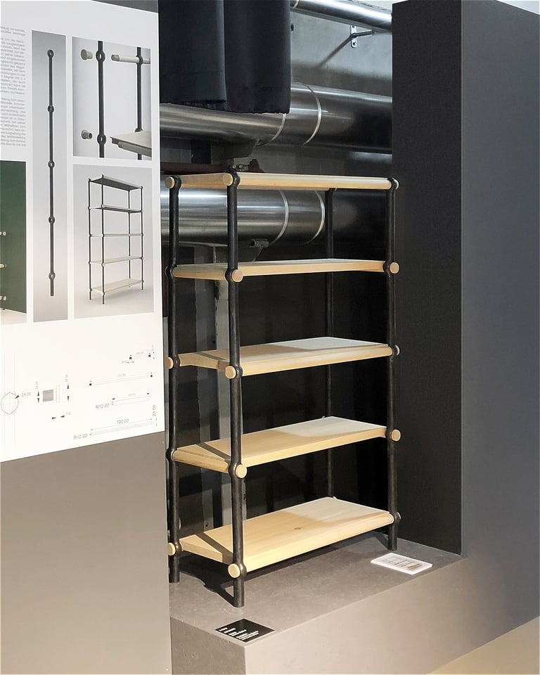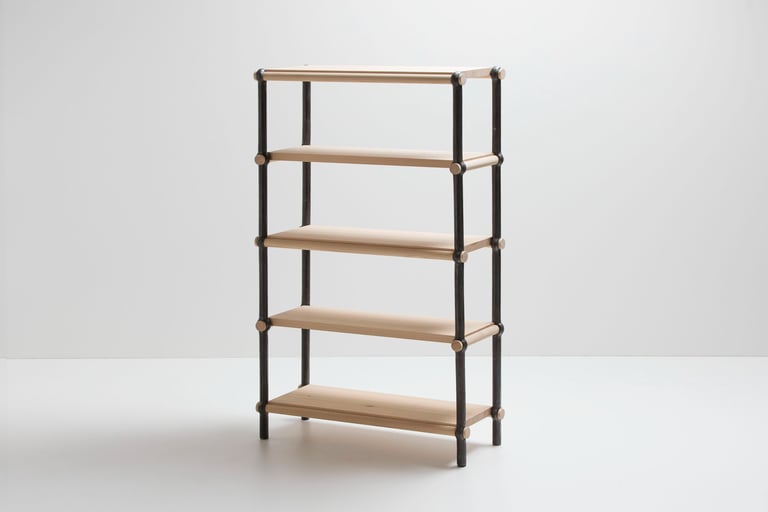 The shelving system INPUNCTO is inspired by hand-forged stair railings, where a tapered pin is driven through heated metal. The circular holes are offset by 90° at each connection point to optimally absorb both transverse and shear forces. This clever construction eliminates the need for a conventional cross brace, keeping the shelf accessible from both sides – and thereby expanding its range of use. The materials, forged steel and solid Swiss stone pine, are combined in a way that allows them to be easily separated and recycled. Thanks to its well-considered system, INPUNCTO is easily expandable and adapts flexibly to the needs of its users.